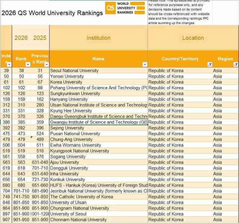 Bảng xếp hạng các trường Đại học của Hàn Quốc năm 2026 ~